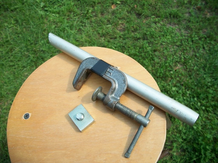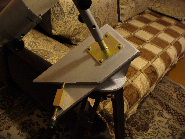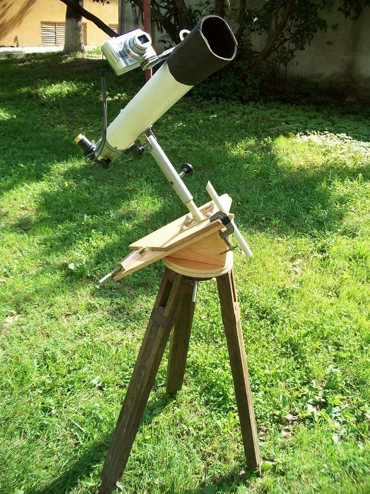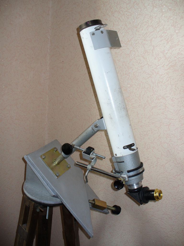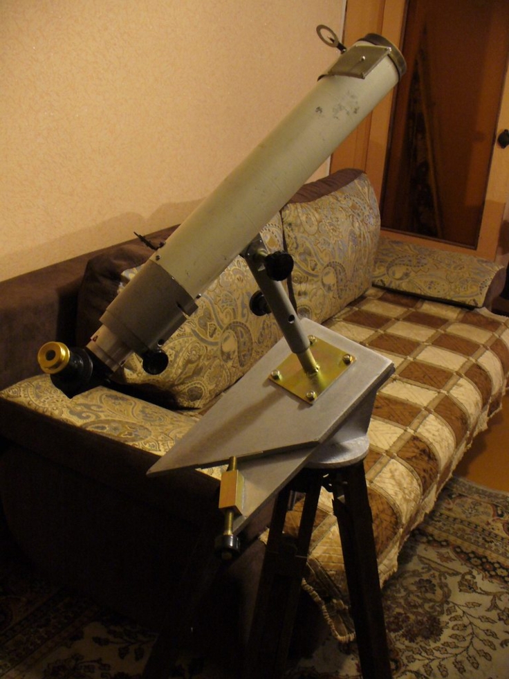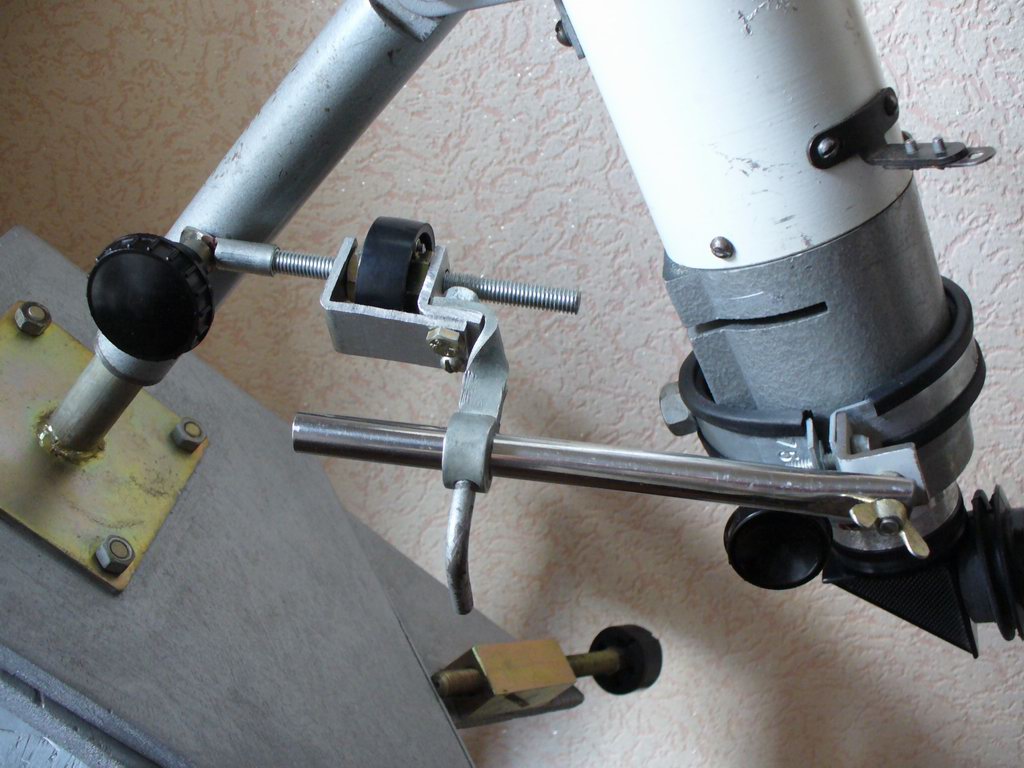 Тренога - от старинного нивелира. Трубка на струбцине - это искатель полюса, он снимается после того, как выставлена полярная ось.