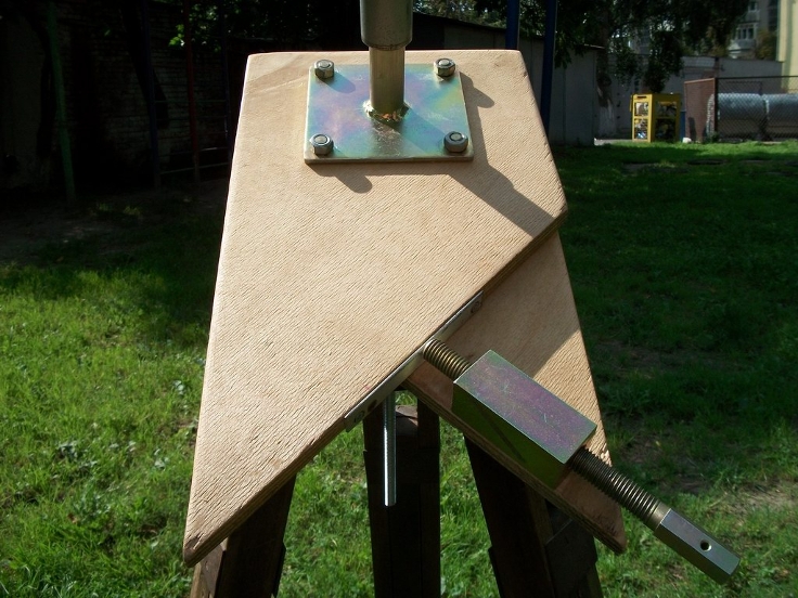 Ось, на которую ставится телескоп, "смотрит" на Полярную звезду, её угол наклона к горизонту равен широте места наблюдения (в моем случае примерно 52 градуса). Размеры деталей не привожу, они могут быть разными, в зависимости от телескопа, треноги, имеющихся материалов и так далее.