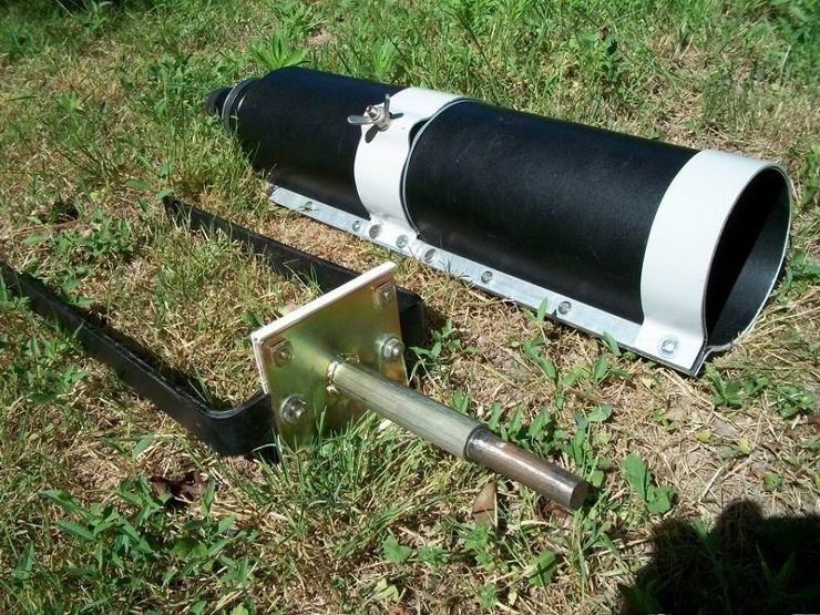 Труба свернута из листа алюминия, очень легкая, черная матовая краска - заводская. Фокусер - из какой-то сантехники (продаются такие штуки в хоз. магазинах, не знаю, для чего они). Окуляры - прикручиваются (кольца для макросъемки M39). Хомуты - полосы из какого-то металла, вилка согнута из стальной полосы.