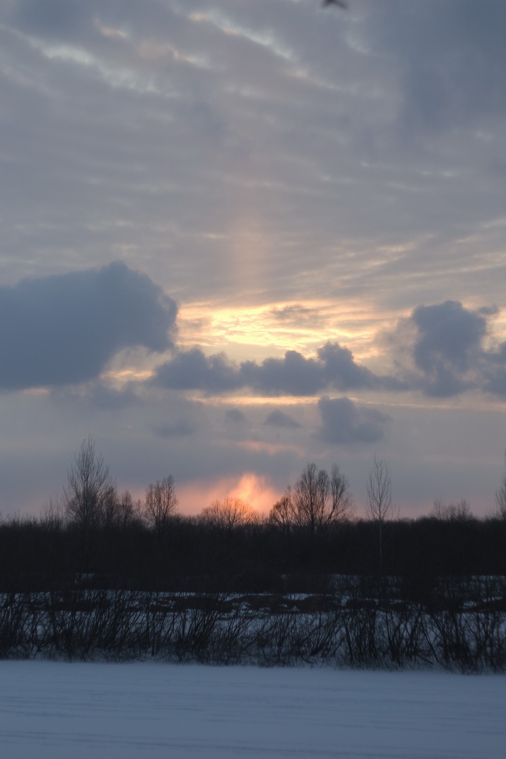 Красивая облачность и световой столб при заходе Солнца. Гомель, 17 марта 2013 г.
